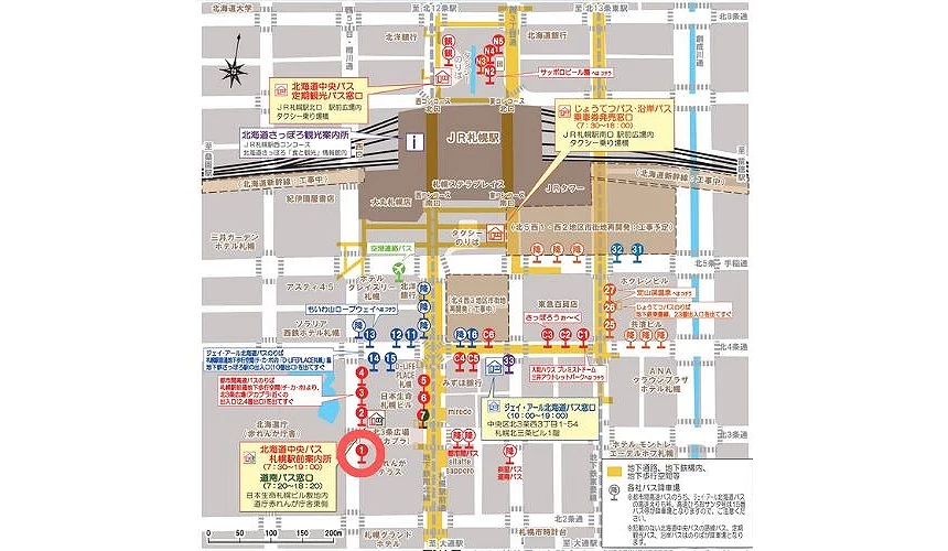 需要注意的是,由于札幌车站目前正进行新干线工程,巴士乘车处位置暂有变更,从札幌车站步行至1号乘车处约需7分钟。详细资讯请参阅札幌市官方网站。