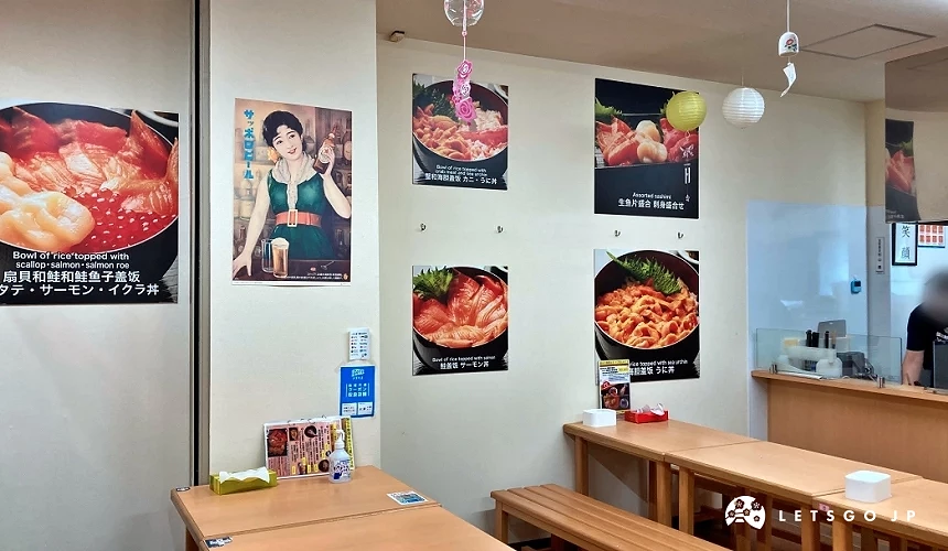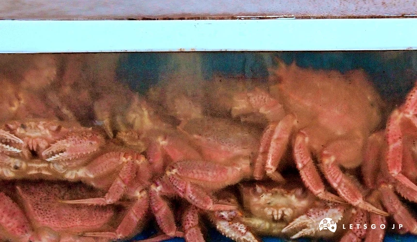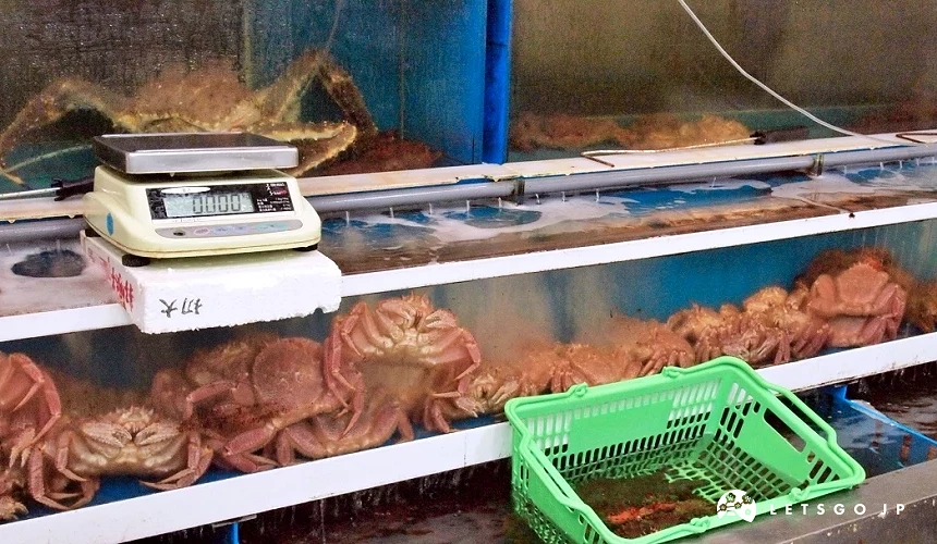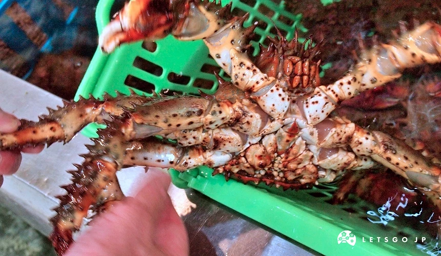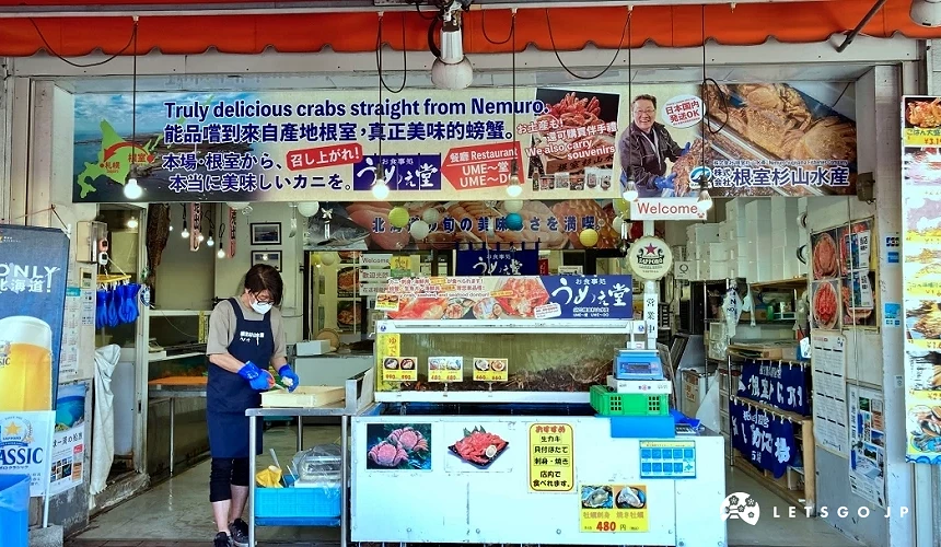 走在中央批发市场场外市场的主要道路上,可看到显眼的橘色招牌上绘有一只螃蟹图案,底下写着根室杉山水产的字样,就是「美味堂」的所在地了。不仅位置好找,内部还有水槽能直接挑螃蟹,且有各式各样的新鲜海鲜可买。正面店铺有一个用餐区之外,隔壁小巷里还打通了两间宽敞明亮的食堂。老板说本来只有店面和一个用餐区,后来因为越来越多客人慕名而来,就打通了两间食堂,变成了现在的规模,可见它多有人气!