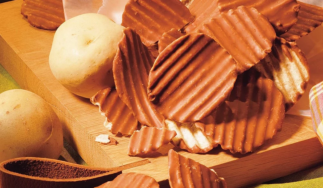 创立于1983年的北海道巧克力品牌「ROYCE'」,以「打造不输欧洲的巧克力」为理念,其代表商品之一「巧克力洋芋片」自2002年推出以来,即以意想不到的咸甜组合掳获人心。波浪切片的洋芋片单面淋上浓郁巧克力,既保留马铃薯的香脆口感,又让甜与咸达到绝妙平衡,让人一吃就停不下来。