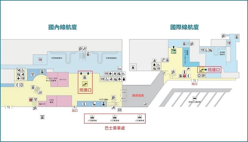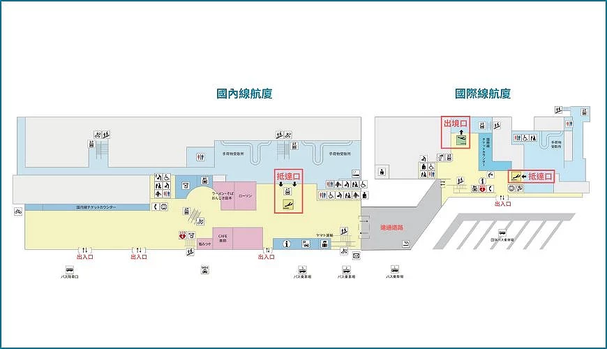 函馆机场 1F 地图,左为「国内线航厦」,右为「国际线航厦」